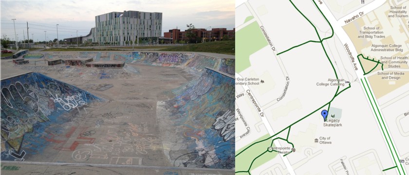 The final stretch of the Experimental Farm Pathway took me to a big parking lot behind Centrepoint Theatre where I happened upon this well used Legacy Skate Park. The building in the background is the Algonquin Centre for Construction Excellence, a building touted for its exceptional green design.