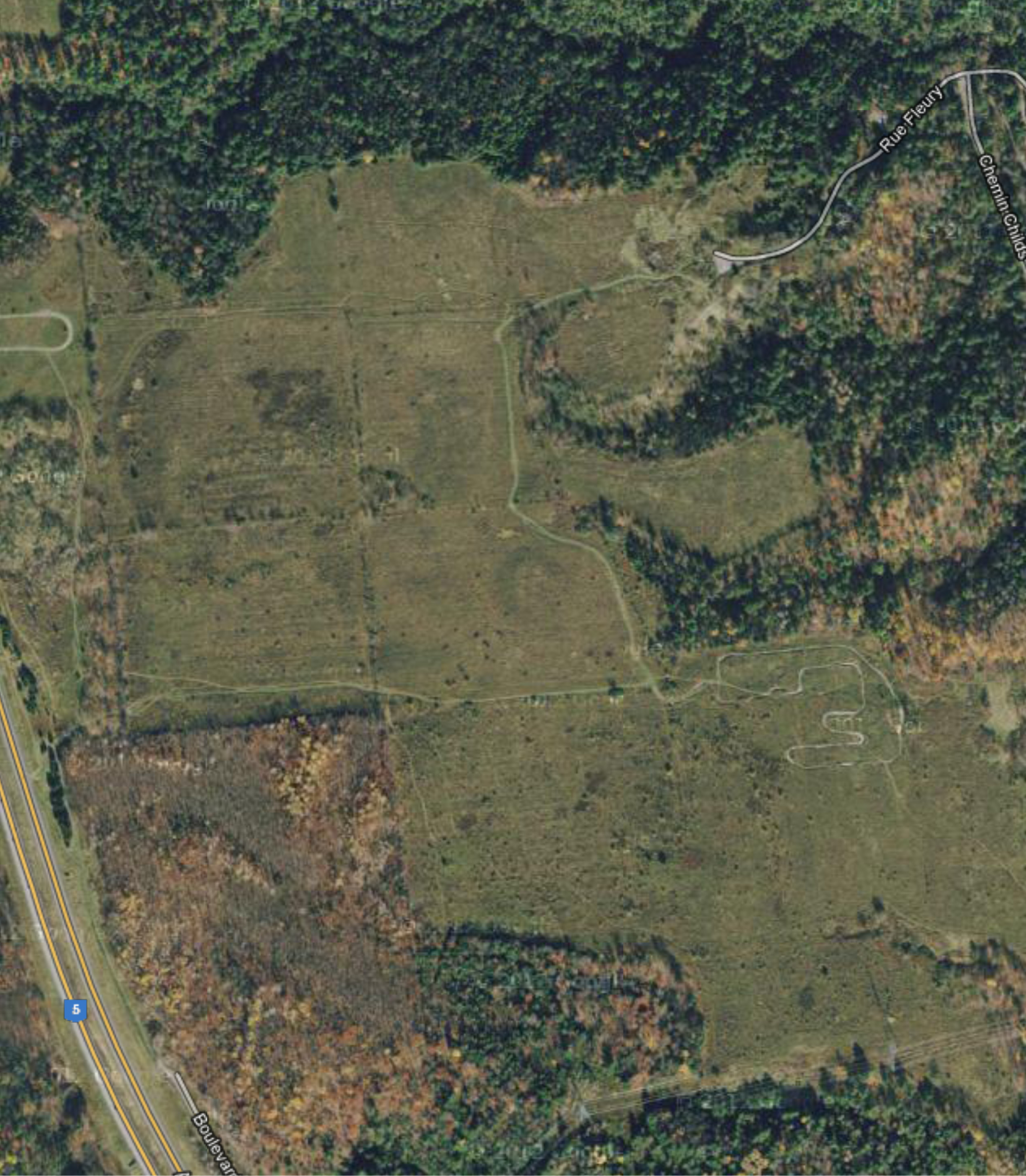 According to my map, the Boulevard suddenly ends at the edge of an open field. One way to check for unmarked roads or paths is to choose Satellite view in Google Maps. As this image shows, there seemed to be a faint indication of paths criss crossing through the field north of where the Boulevard ends. Noticing that some of these paths lead to Rue Fleury on the eastern side, I decided to try my luck.