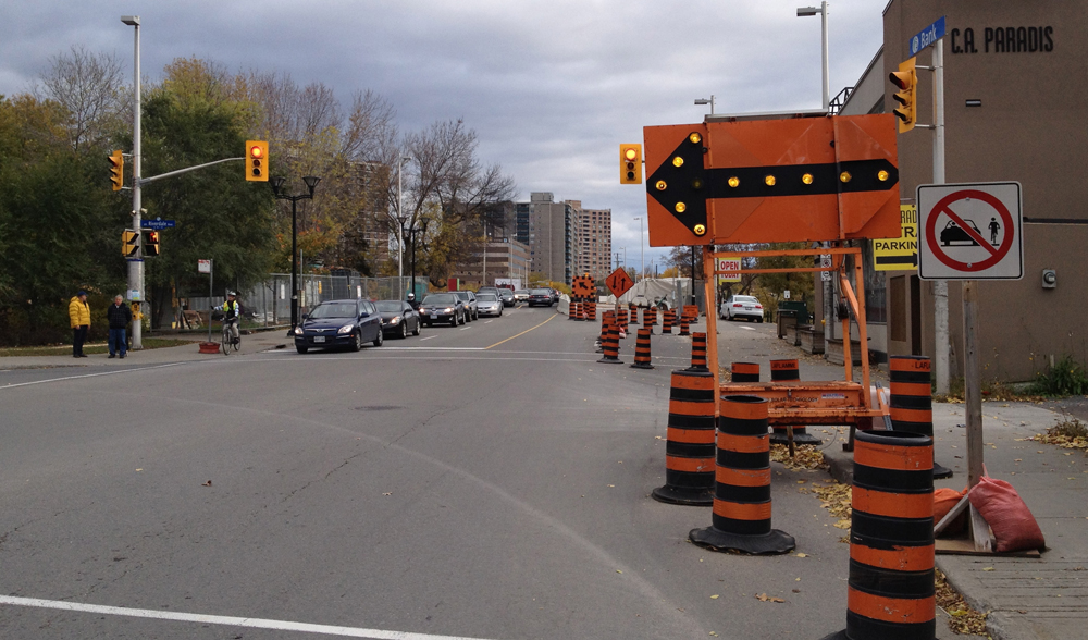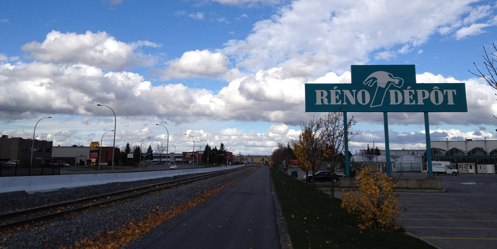 Pretty soon there will be a bike path all along Boulevard de la Carrière, which you can take from Pilon to Réno, but right now they are in the middle of road repairs. Lousy to bike through. The changes to the road will result in separate lanes for cars, buses, trains and bikes. Here’s how it will appear, as seen in this section completed closer to Réno.