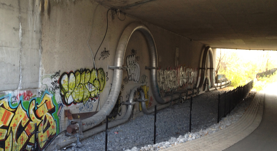A final look at big steam pipes on the way back seen from under the Portage Bridge.