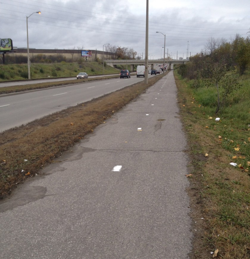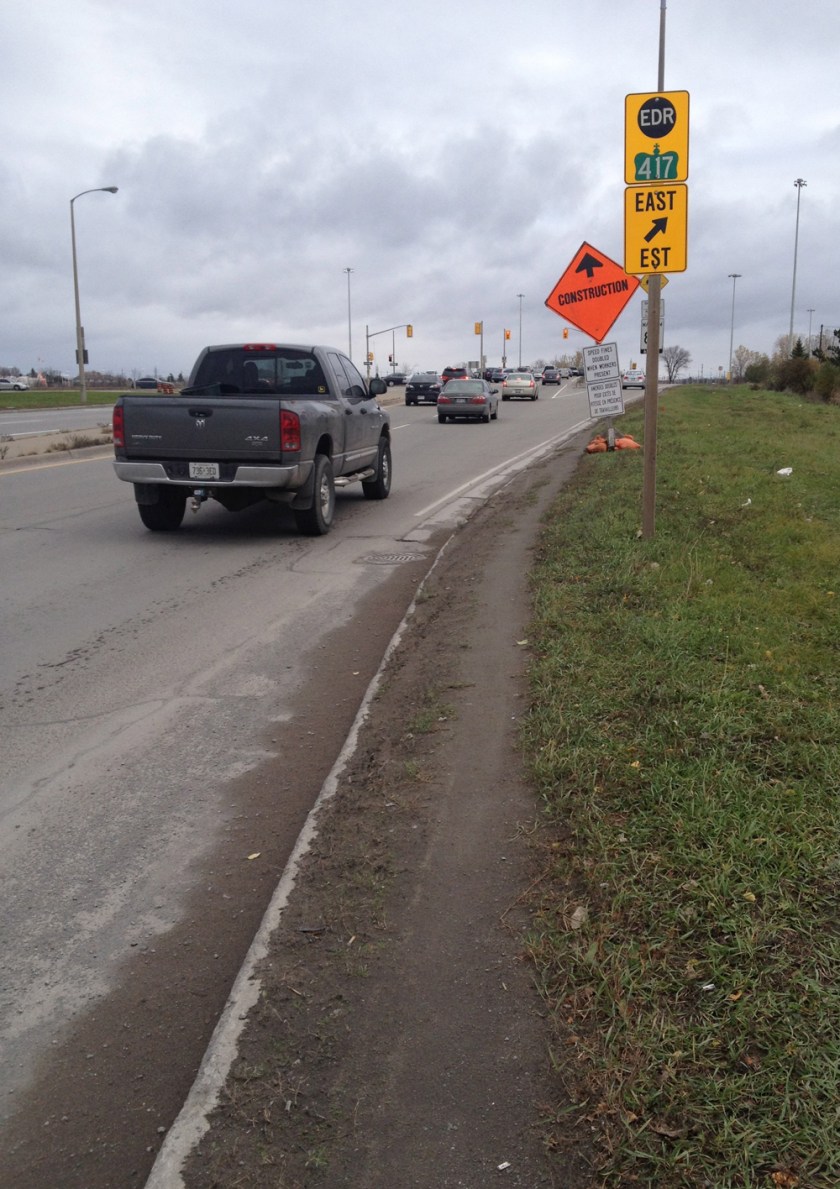 In desperation pedestrians and bicyclists alike must have forged the precarious dirt path hugging the guard rail to avoid being hit by speeding traffic flying along Innes. This madness continues until just beyond the 417 West off-ramp, where the bike lane picks up again.