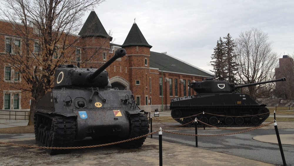 These two tanks, parked on display outside the Salaberry Armoury at the corner of Boulevard Alexandre-Taché and Boulevard St Joseph, are dedicated to the resident Régiment de Hull.