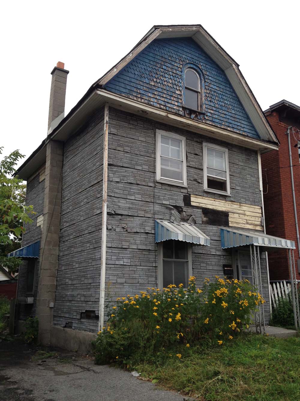 Last stop is in Chinatown on Arthur Street, a block away from home. This is the saddest of the lot, as it is gradually crumbling into complete disrepair. You can see the exposed original wood siding beneath where the Insulstone is falling away. (Nov ’13 update – This house recently caught fire. So sad.)