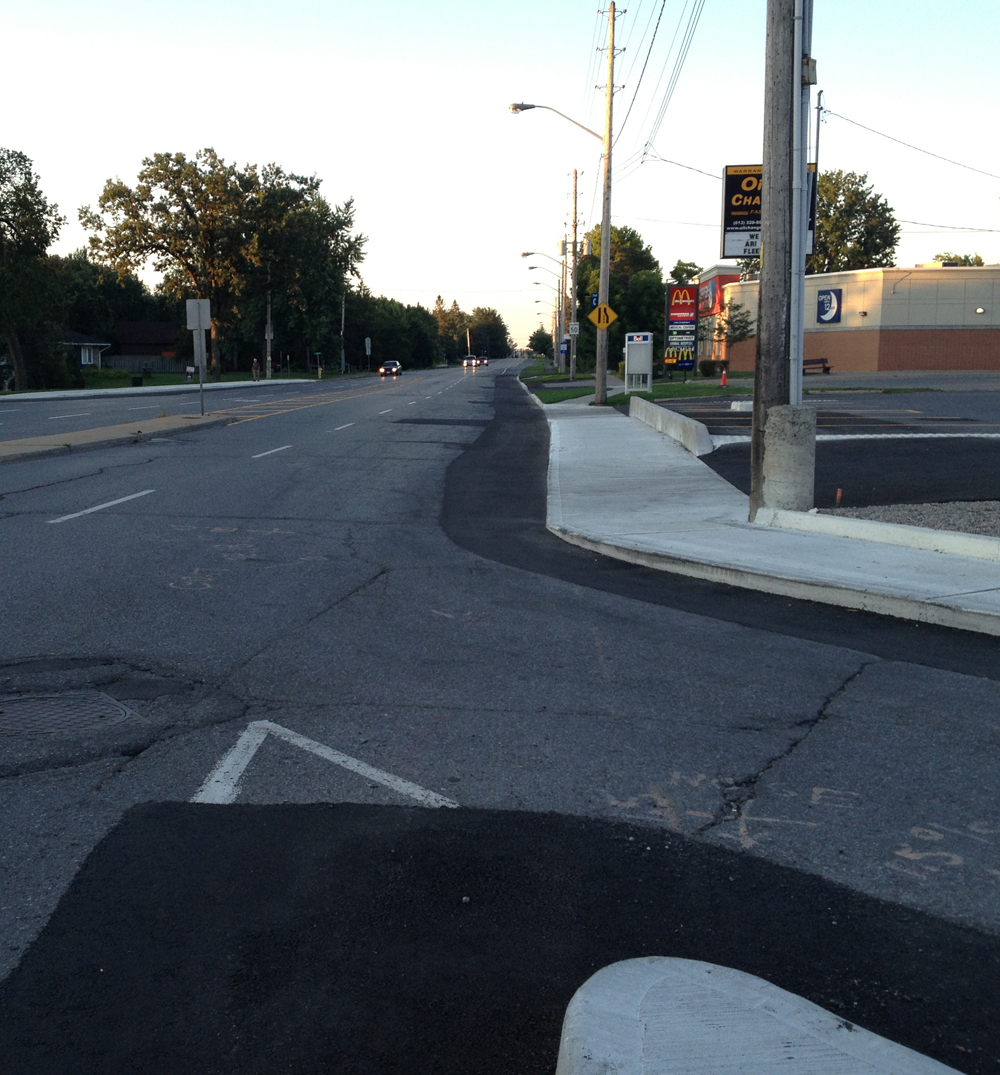 The city has done a fine thing by removing the concrete protrusion that used to stick out from the edge of the road at the Hog’s Back intersection. Before bikers travelling along the shoulder of the road were suddenly obliged to merge into traffic. This fixes that.