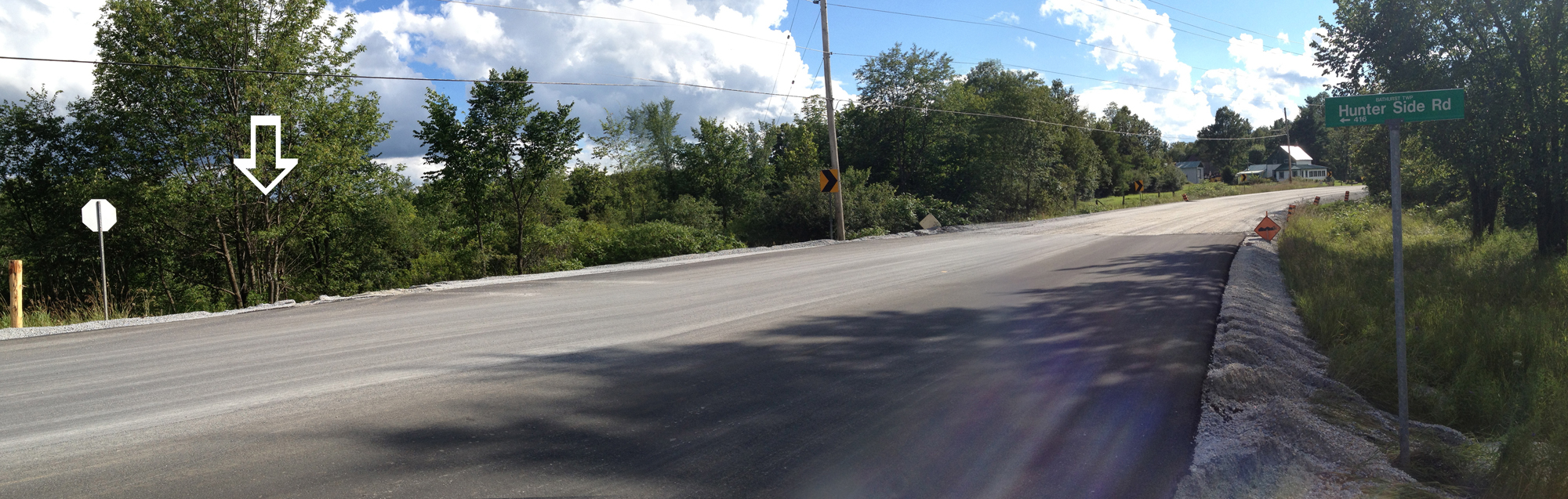 They are also right in the middle of paving the road further south in a way that suggests a wider shoulder will be in the offing. While I was humming along on this fresh asphalt I almost missed a little sign indicating Hunter Side Road, which was supposed to be my next turn. Where was the road? Just there, over the edge where the white arrow is pointing.