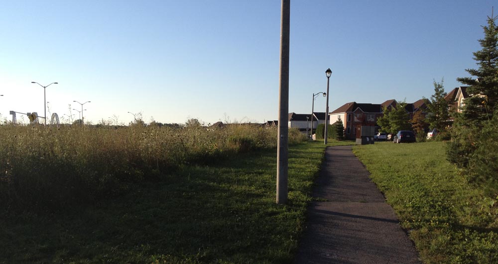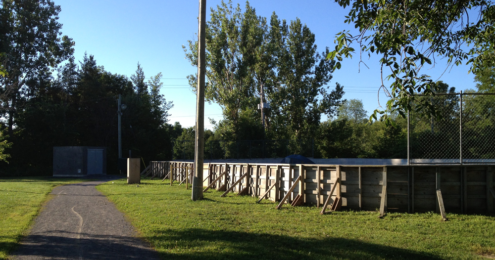 Turn onto McLean Crescent, until you reach a path that takes you through George McLean Park. You’ll recognize it by the hockey boards all up and ready for next season.