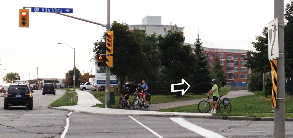 Unfortunately the problem persists at all other intersections between Hogs Back and Fallowfield Road, the worst instance being the approach to Rideau Heights Lane where Prince of Wales takes an uphill turn, providing little chance for overtaking traffic to notice riders. I rode off the road onto the well worn gravel path shown below. This worn path’s existence is indicative of how much this corner is a safety problem for bikers and pedestrians.