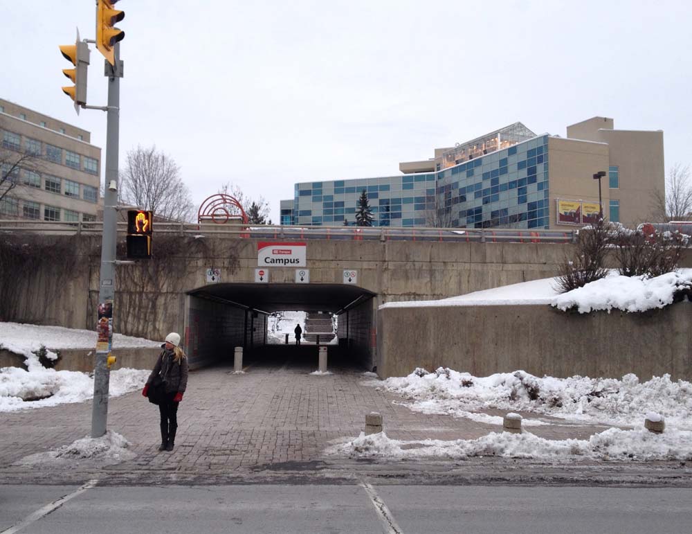 I crossed the driveway at the crosswalk and follow the path under the transitway bridge right up through campus.