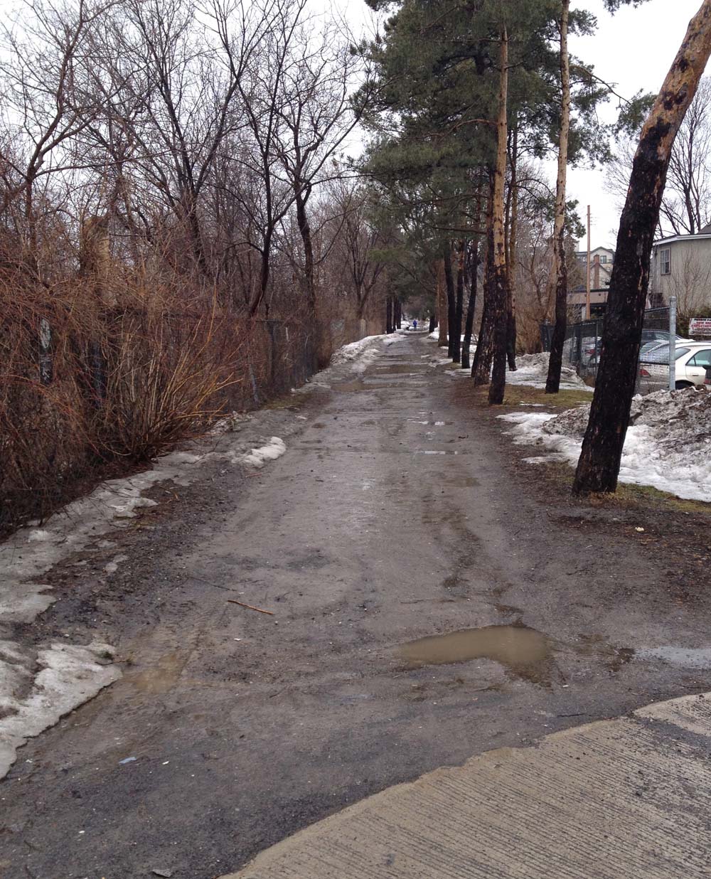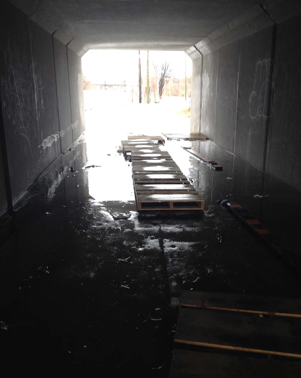 The underpass is not so good. Someone put down wooden pallets to get across the ice and puddles.