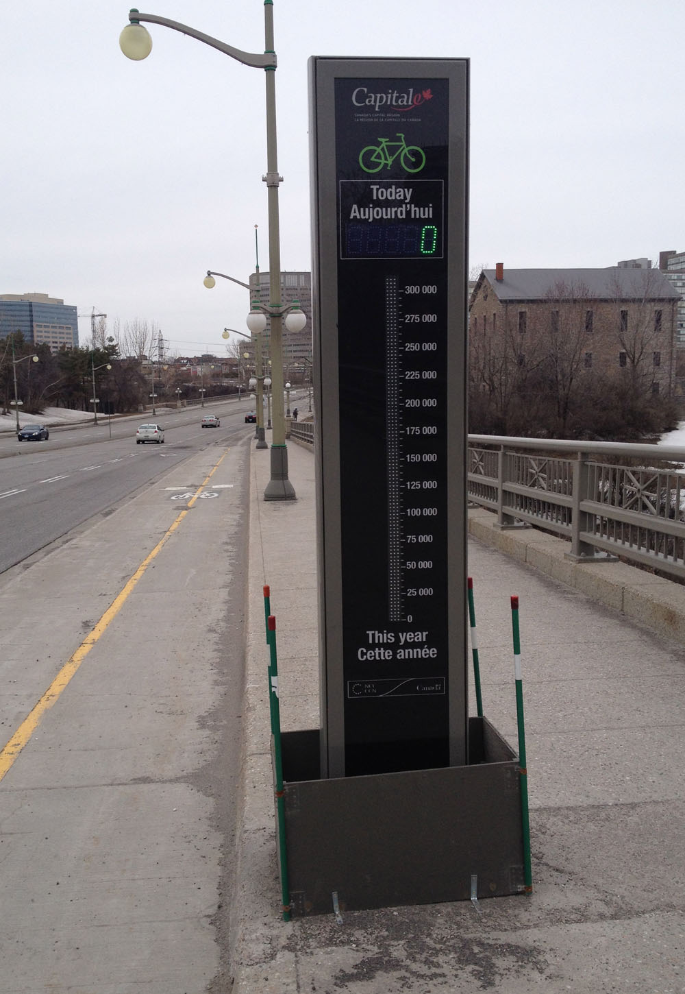 And away we go, down the Laurier bike lane as far as Bay Street, then north along the Bay St bike lane to Wellington where the path rolls over Portage Bridge. The bike counter installed last year by the NCC is on but the display is stuck at zero. Fear not – according to Jambes-Folles the machine is still tallying the number of riders crossing the bridge on this site she forwarded to me.