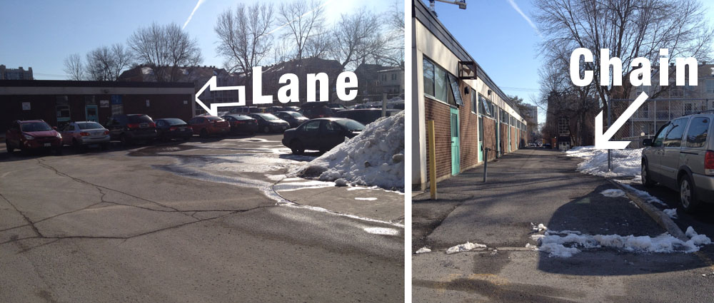 Through the parking lot ….. and down the lane ….. watch out for the chain.