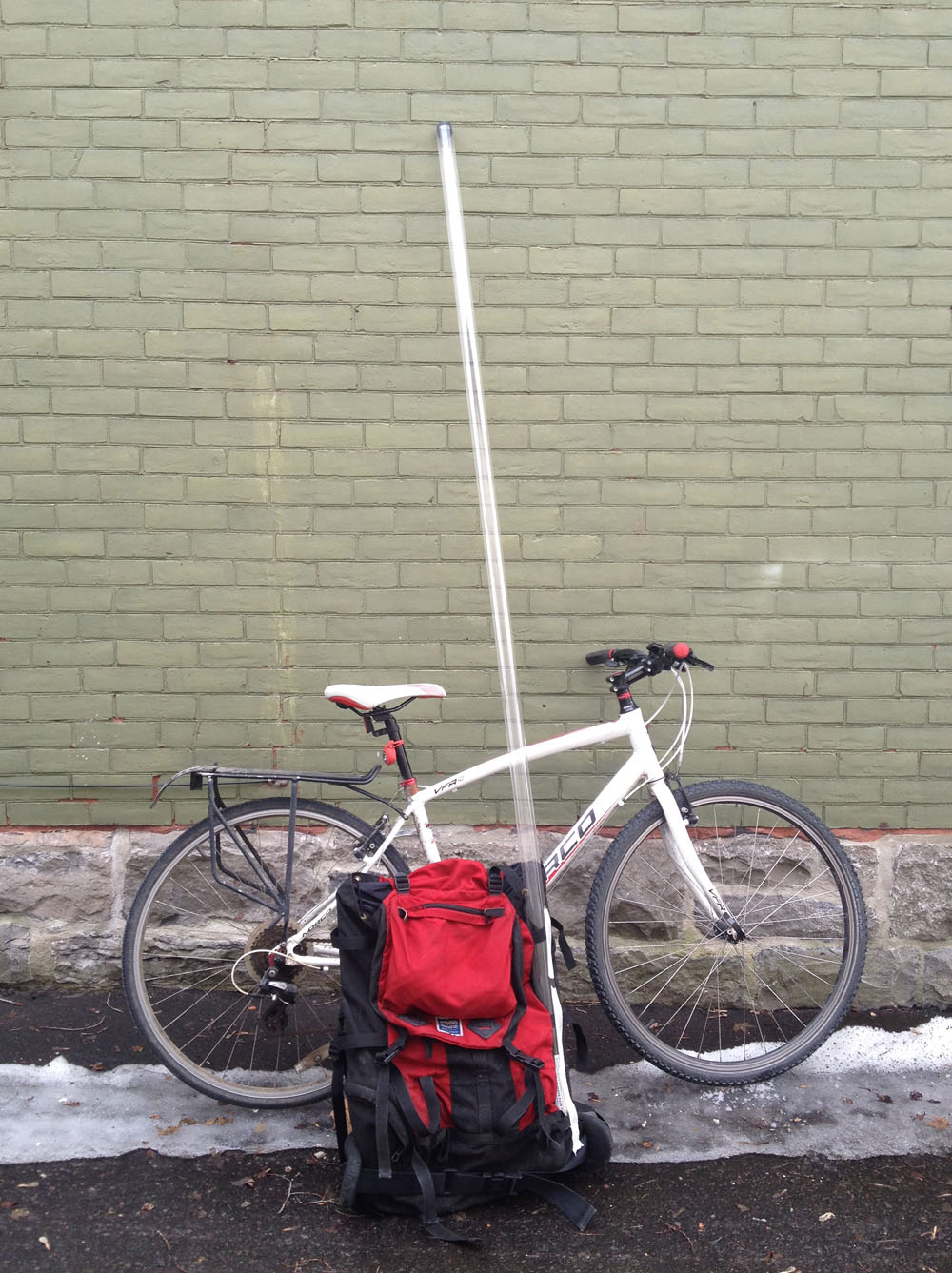 Today I had to drop off an eight foot long clear plastic tube to Les Ateliers du Théâtre de l’Île in Gatineau, to be incorporated into a set I designed. A section of path I usually take to get there is still covered in snow, as I learnt from Jambes-Folles, an intrepid local rider who has also taken the 30 Days of Biking pledge. So I followed her Tweeted advice on a safe alternate route. Merci Jambes-Folles!