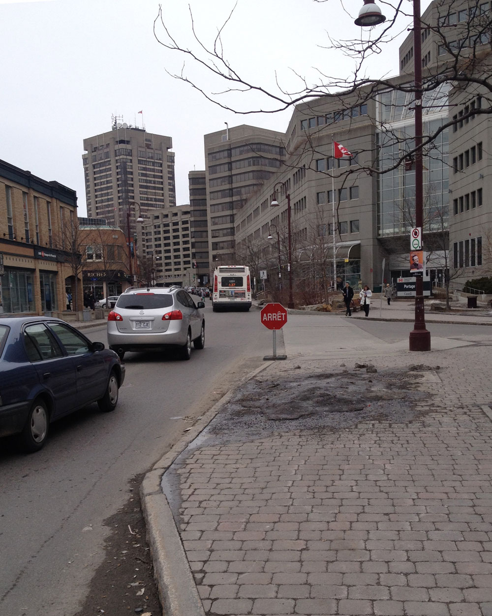 Tube delivered, time to head home. There are lots of squat temporary stop signs like this throughout downtown Gatineau these days to watch out for.