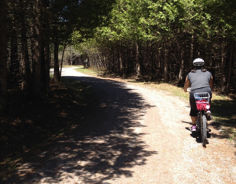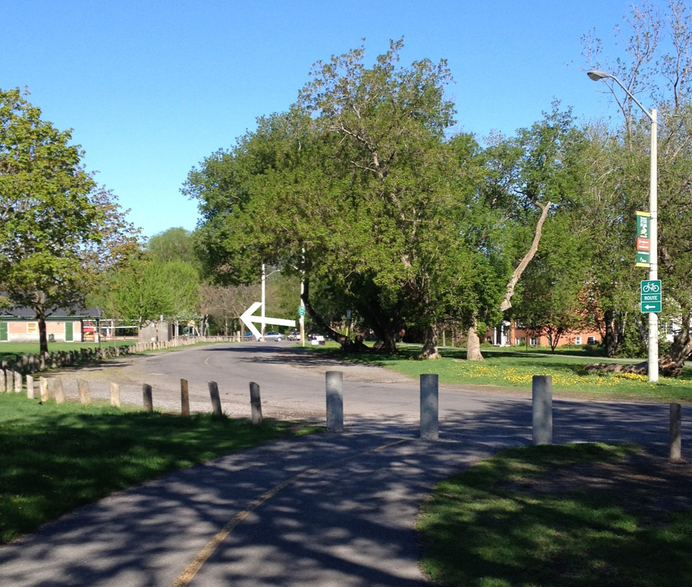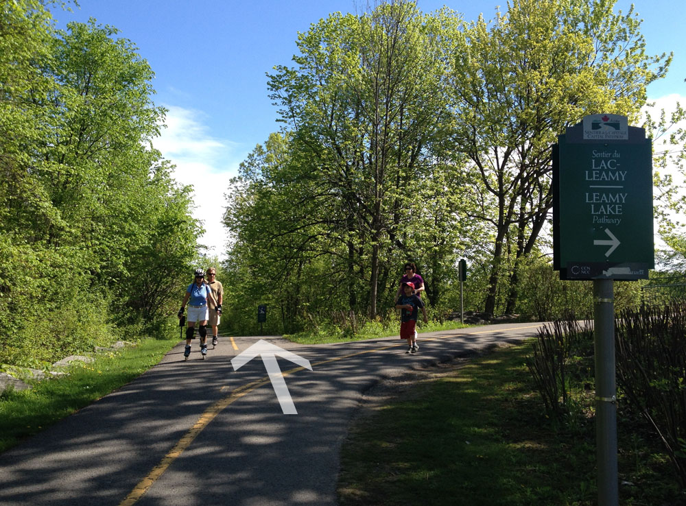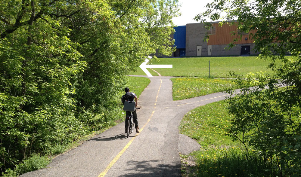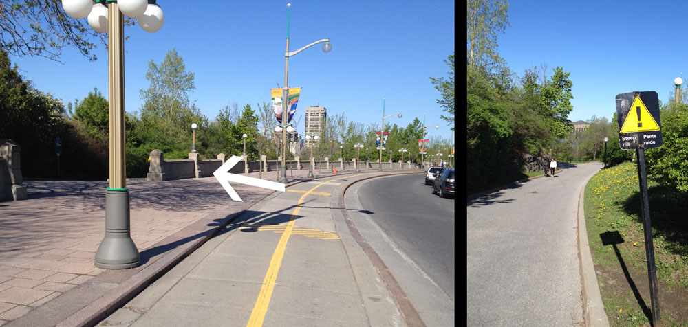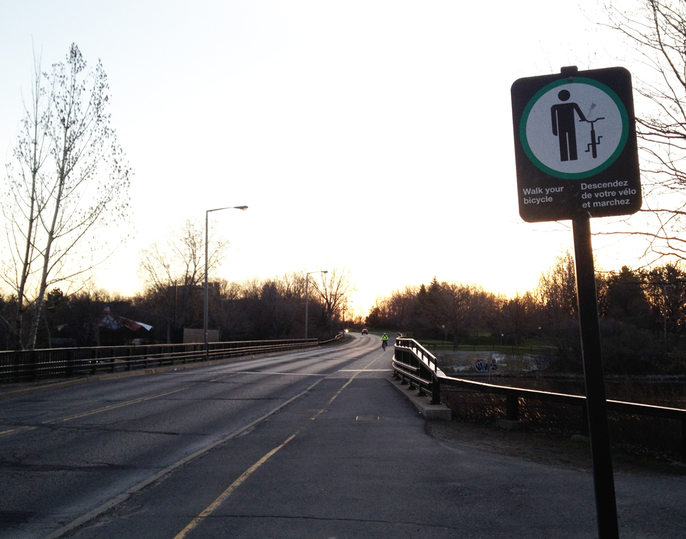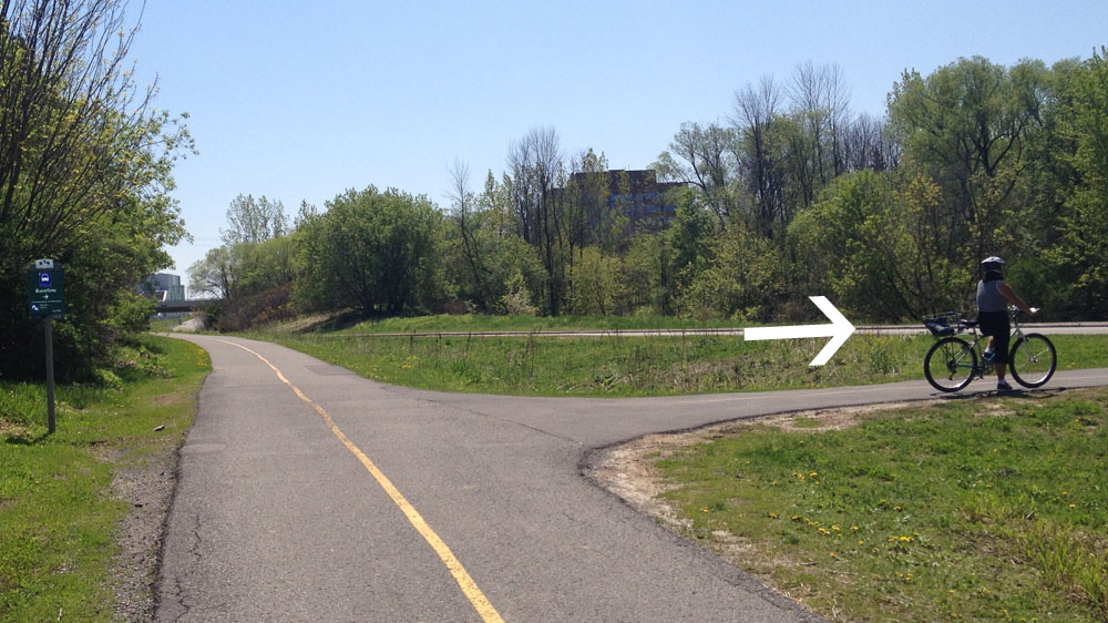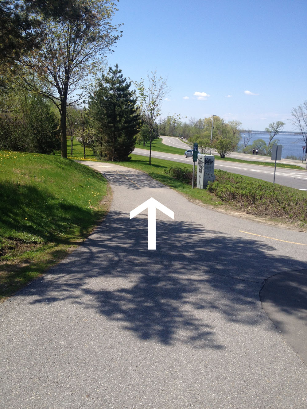Heading towards Pointe Gatineau along this alternate route would require biking on the sidewalk against traffic as far as the lights across from the start of the bike path beside the transit way, however I’ve rarely seen any pedestrians along this sidewalk. If any are encountered there is plenty of opportunity to see them coming to dismount and walk your bike past them with a great big smile! So there you have it – a few fine ways to bike to Pointe Gatineau!