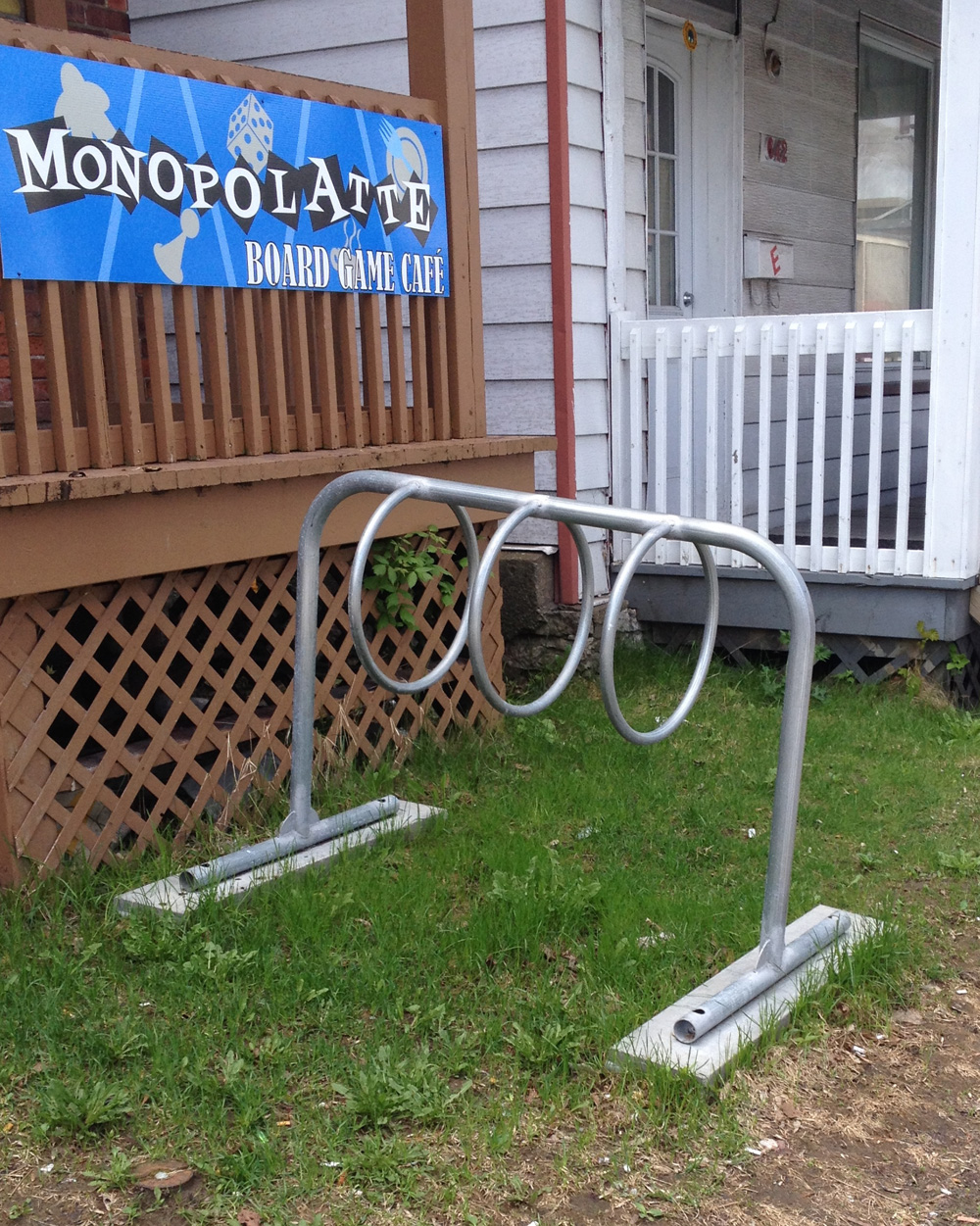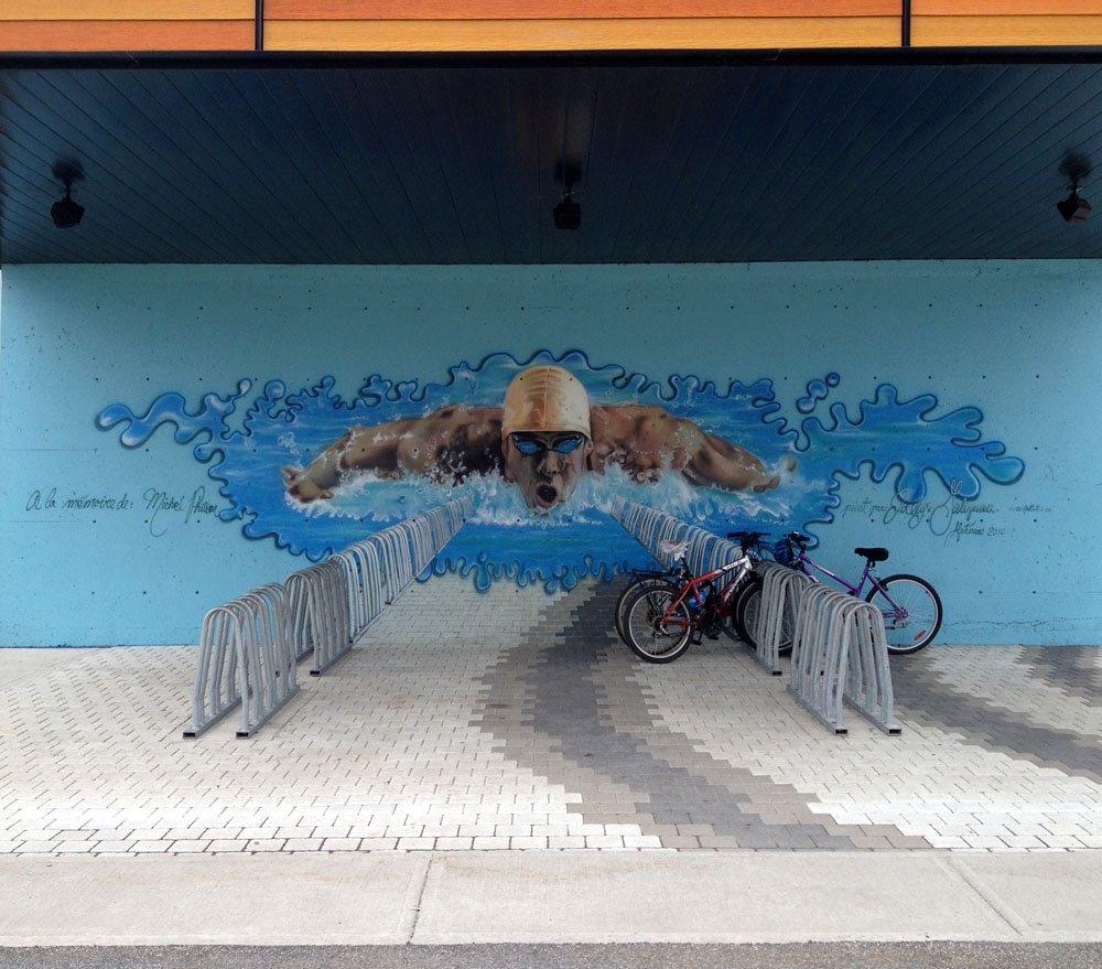 There’s a swimming pool close by with one of the cleverest bike rack/wall mural combos in the region.
