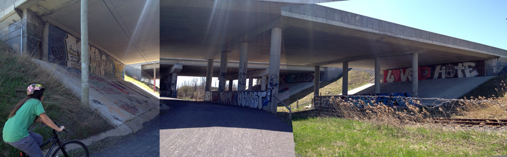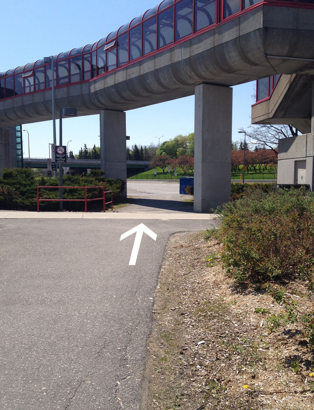 The path forks at the edge of the elevated Rapibus transit way. I followed the path to the right under the transit way.