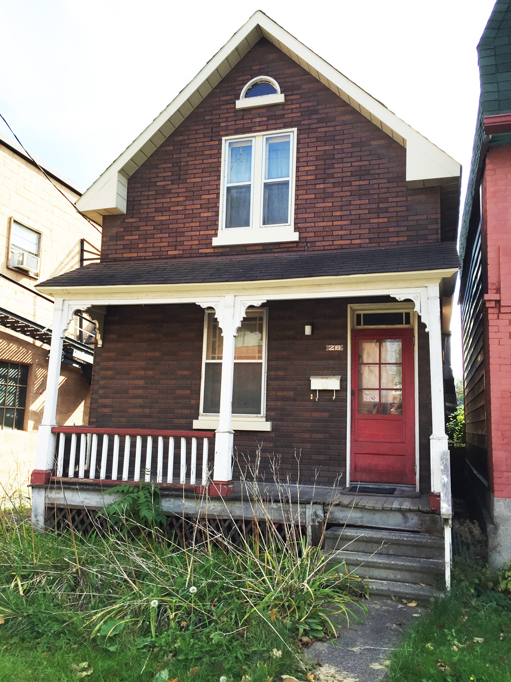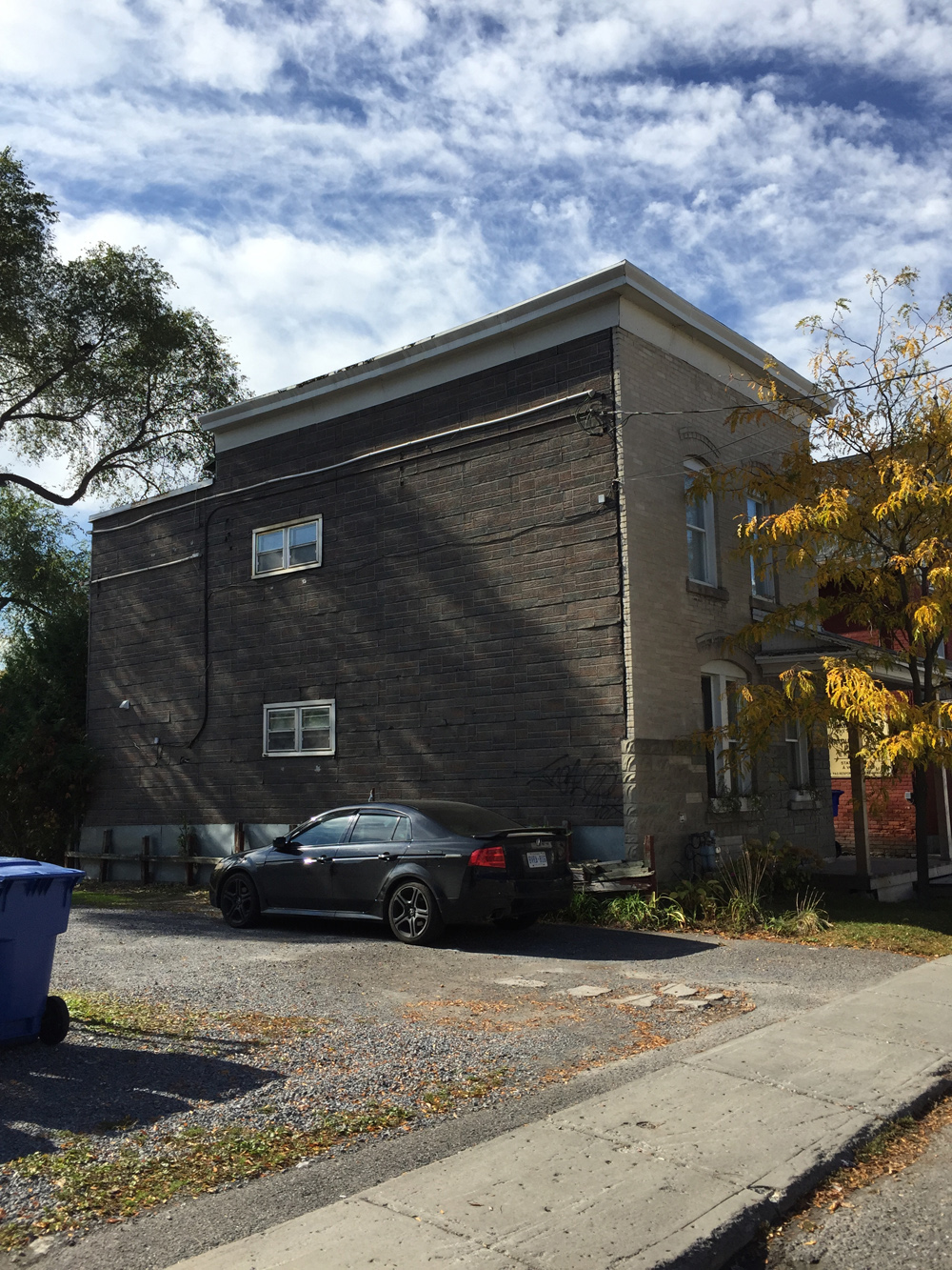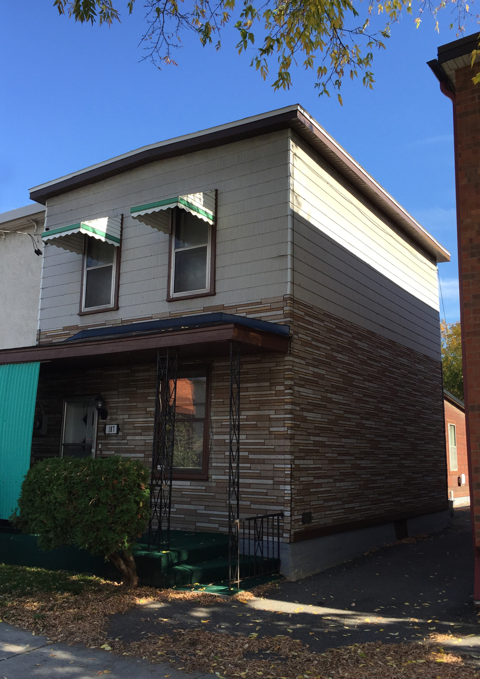 First stop – 187 Rochester, where you’ll find this interesting multicoloured extended brick pattern. Note the top portion is covered with fiberglass siding. Because Insulbrick is flat, stable, and easy to nail through, much of it has been covered up with whatever subsequent siding was fashionable. I’m guessing there is a lot of Insulbrick covered up in this manner all over the region. UPDATE March 2021 – The Insulbrick has been ripped off and the whole exterior is undergoing a big reno.