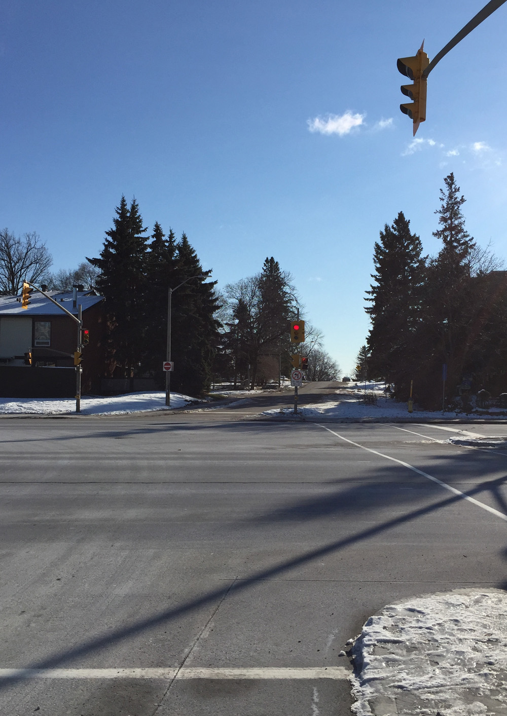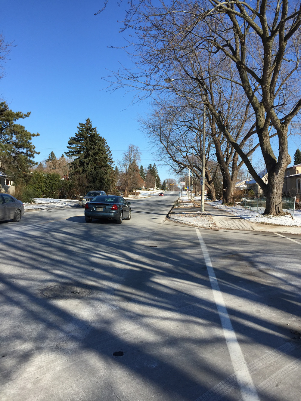I then wove may way along quiet residential streets, eventually accessing Meadowlands Drive from Rowley Avenue. I often hear mention of Meadowlands in radio traffic reports, which is usually indicative of a pretty busy street. It was indeed, however the single lanes are quite wide. Not too encouraging for winter riding I realize, as that’s where snow gets piled. This route follows Meadowlands for just half a block, and the cleared sidewalk was safe enough to walk your bike. Or, one could ride along the sidewalk if there are no pedestrians, but I’m not suggesting anyone do that.