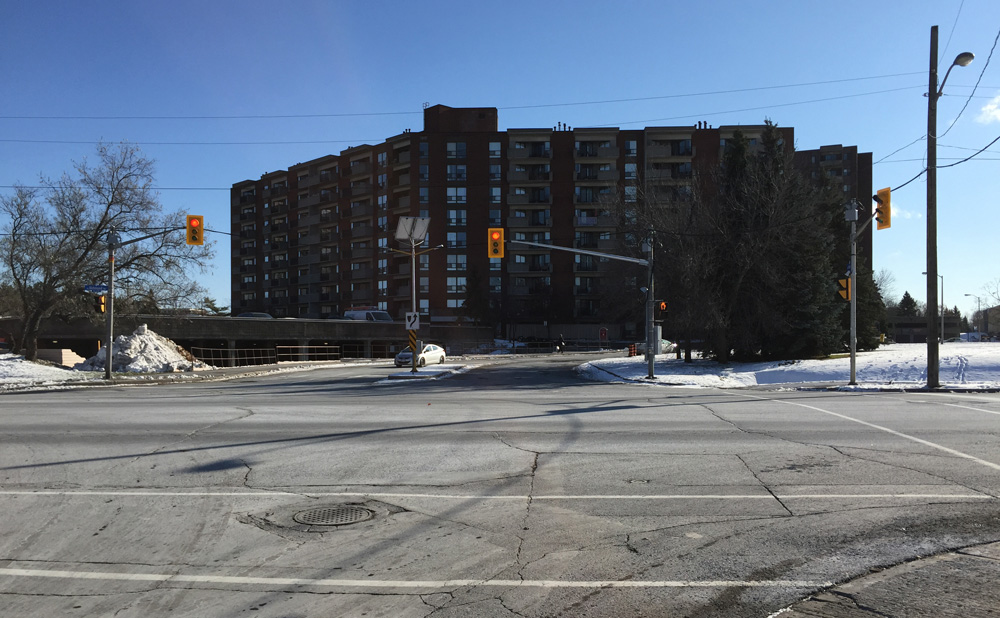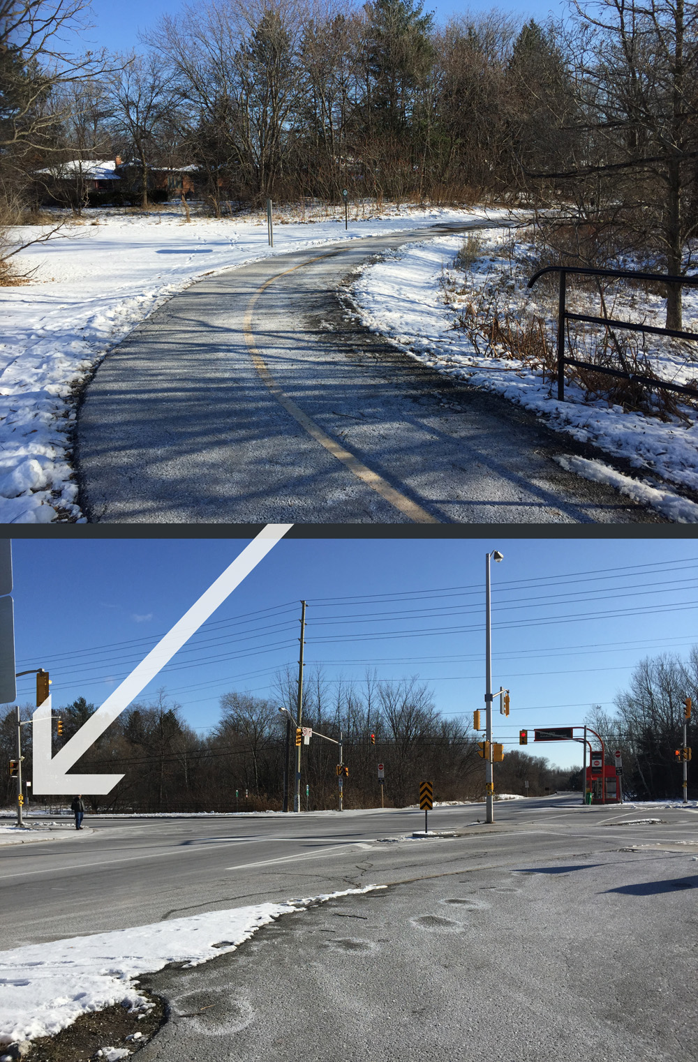 To get across Woodroffe Ave I left the path and crossed at the intersection opposite College Avenue.