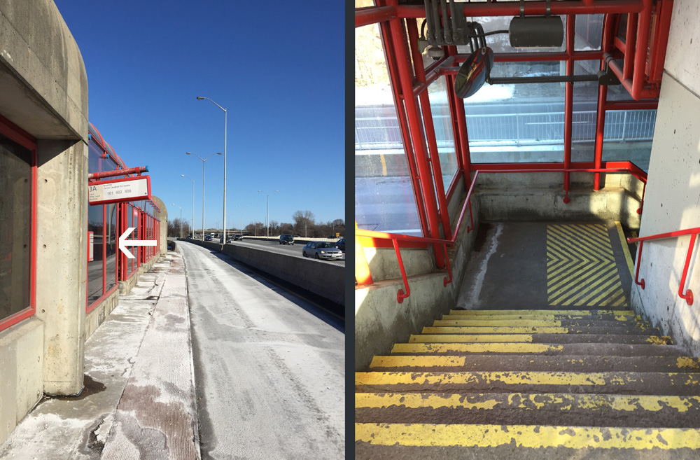 The cleared/salted section of path follows alongside the Queensway to the OC Transpo transit stop. I carried my bike down the stairwell one level to the Transitway. I could have taken the elevator.