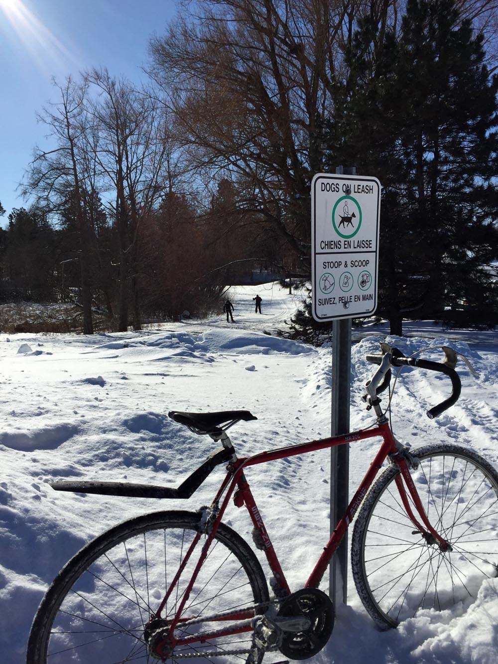 To get to the groomed ski trail I took the well travelled path just to the right of the Dow’s Lake service ramp. If this path proves to be inaccessible by bike, I would lock my bike to a post or canal railing near the pavilion and ski in from this location, however on this occaision I had no difficulty getting through.