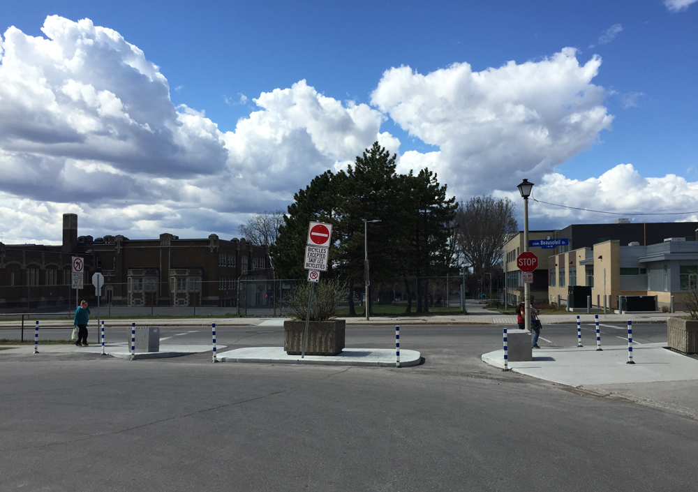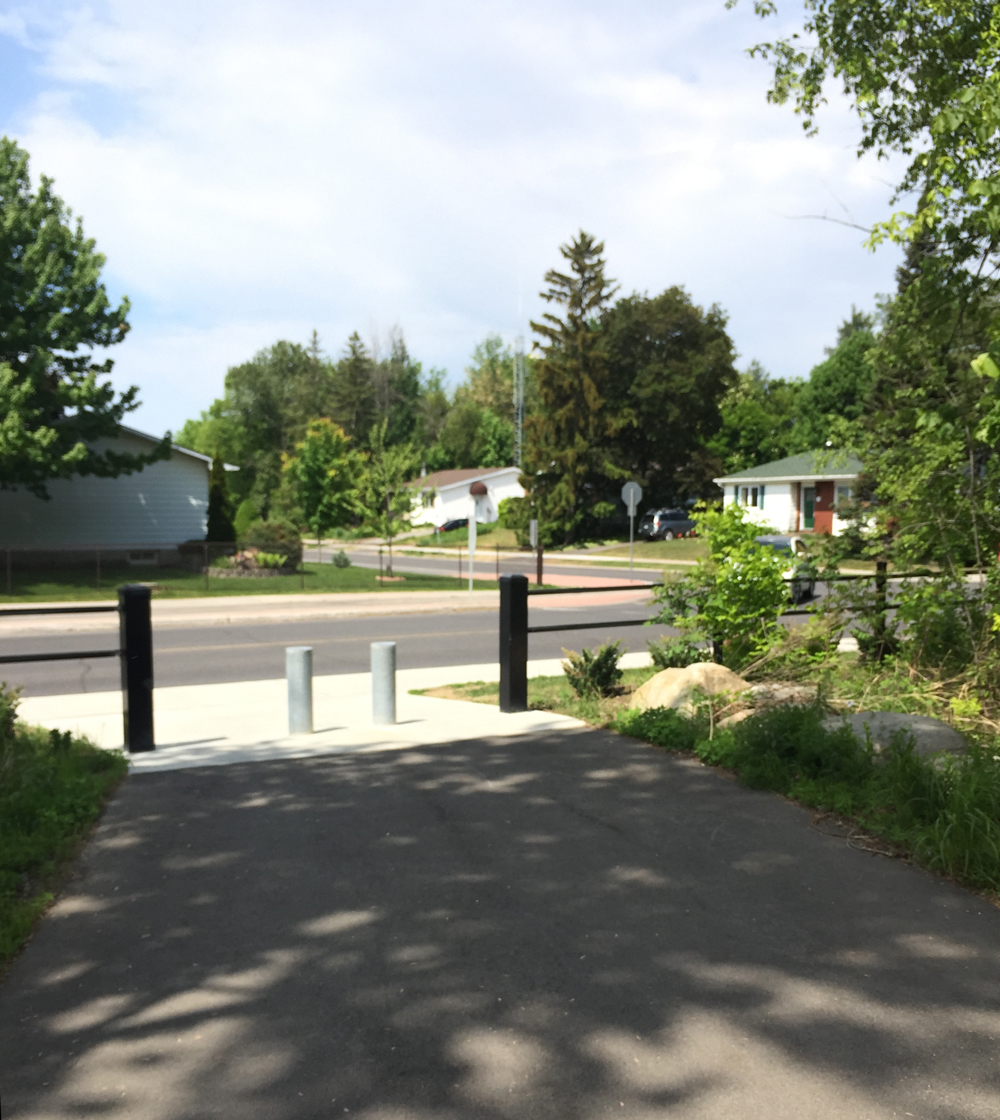 We rode through the parking lot to get to the bike path that runs along Innes Road as far as the Trans Canada Highway. There are no bike lanes or even sidewalks along the bridge that goes over the Trans-Canada and cars fly on and off the ramps to and from the highway. To avoid this terrible section we turned north on Star Top Road, then south east along Cyrville Road over the Trans Canada. Cyrville is not a great road to ride along either but is the least dangerous option of the two, with no highway on and off ramps to worry about. On the east side of the bridge there is a bike path that starts beside the entrance to the Home Depot to Innes Road.