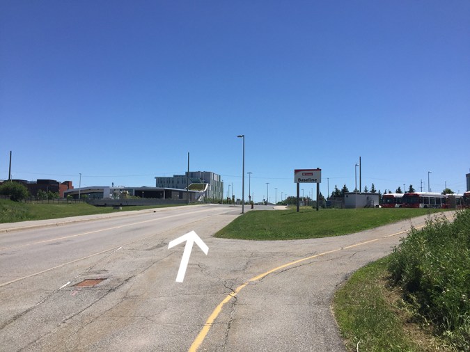 The path continues parallel to Woodroffe, then veers west just before reaching the Legacy Skatepark. It then continues westwardly, twice crossing Centrepoint Drive.