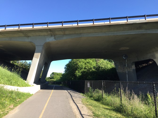 I crossed Cedarview Road on the west side of Bruce Pit and then rode along the bridge, that has bike lanes, over the 416 highway.