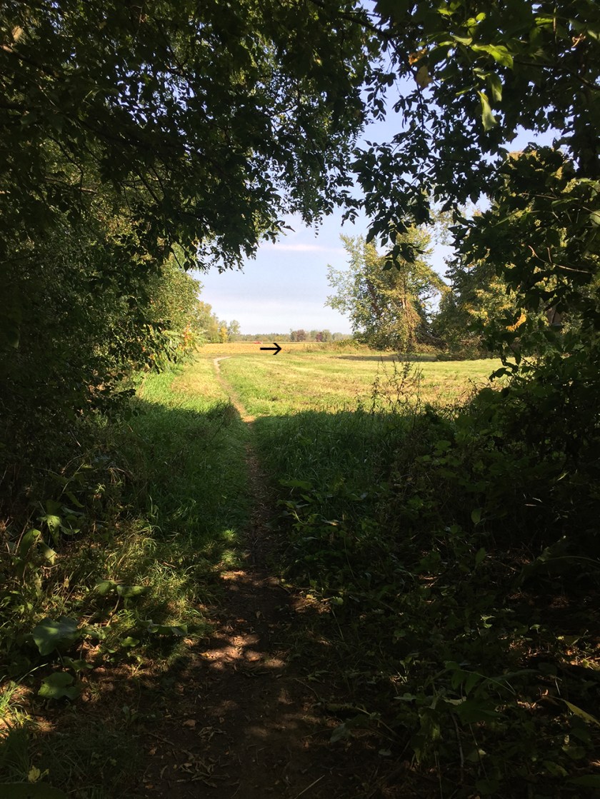 The trail opens up a bit further along and joins another path that cuts along a field. turn right onto this path.