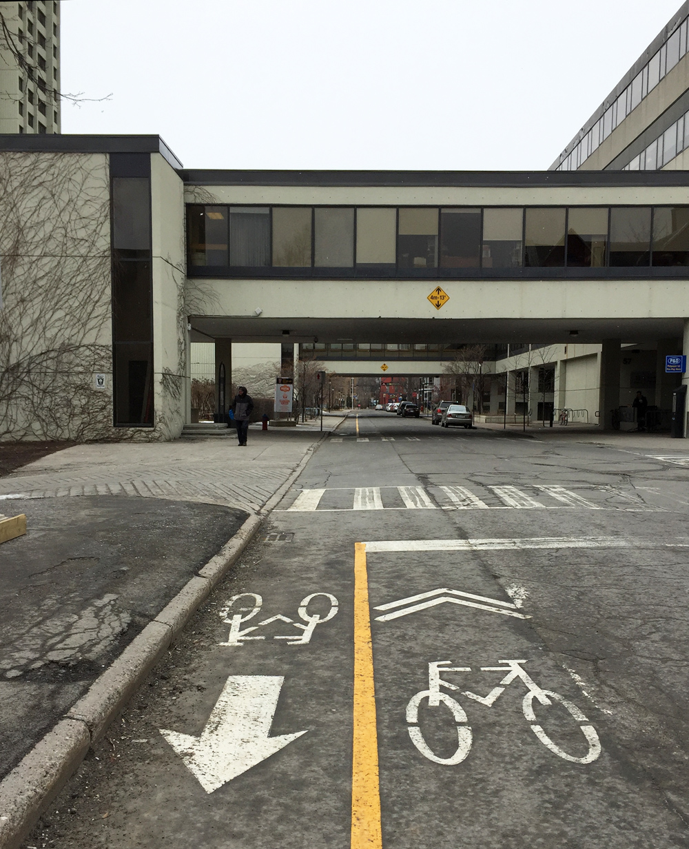 Another signalized crosswalk at Colonel By Drive led me to the bike lanes under Nicholas St and up to the University of Ottawa campus.