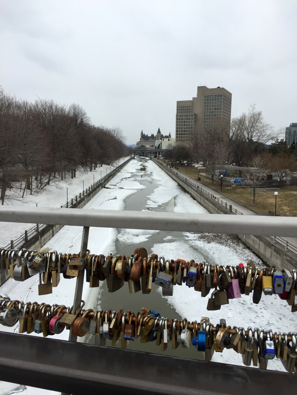 I followed Cartier St for a block, then turned left onto one-way Cooper St, and continued along until Somerset St. Immediately left on Somerset there’s a traffic light across Queen Elizabeth Drive to the pedestrian/bike bridge over the Rideau Canal.