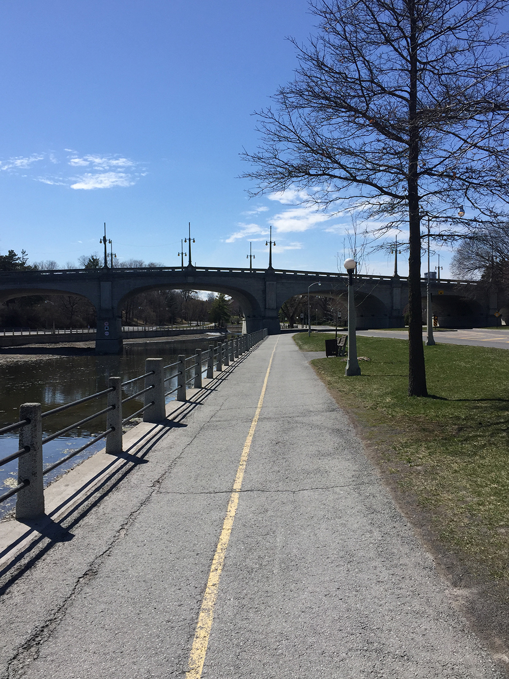 Once over the bridge circle down to your left and continue heading upstream along the Rideau River Pathway.