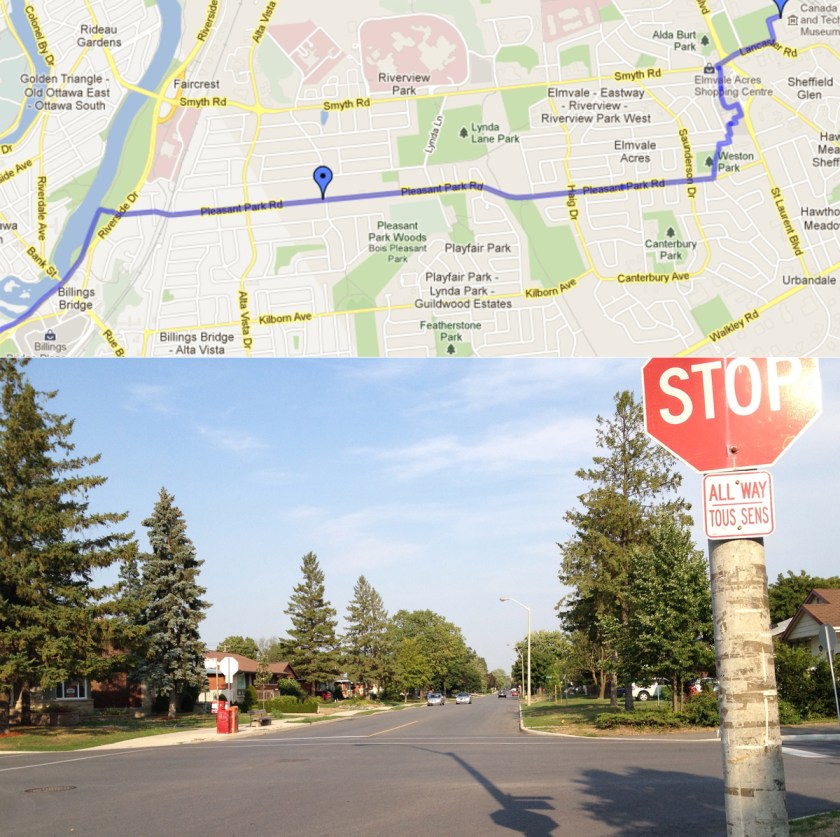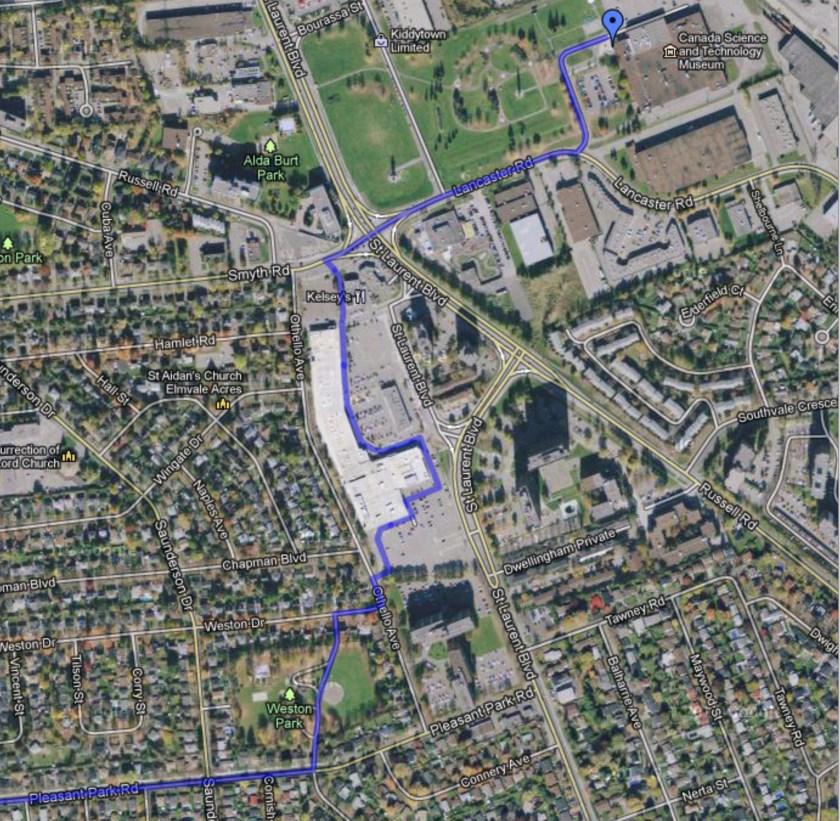 There is an nice shortcut through Weston Park just before the eastern extremity of Pleasant Park Road. Now the messiest part of the route occurs just before reaching Lancaster Road, our final destination. That’s because St-Laurent Boulevard is a convoluted cluster at this point – a very tricky triangle to safely negotiate on a bike SO, I suggest cutting through the Elmvale Acres parking lot all the way to Smyth Road before crossing St Laurent at the intersection.