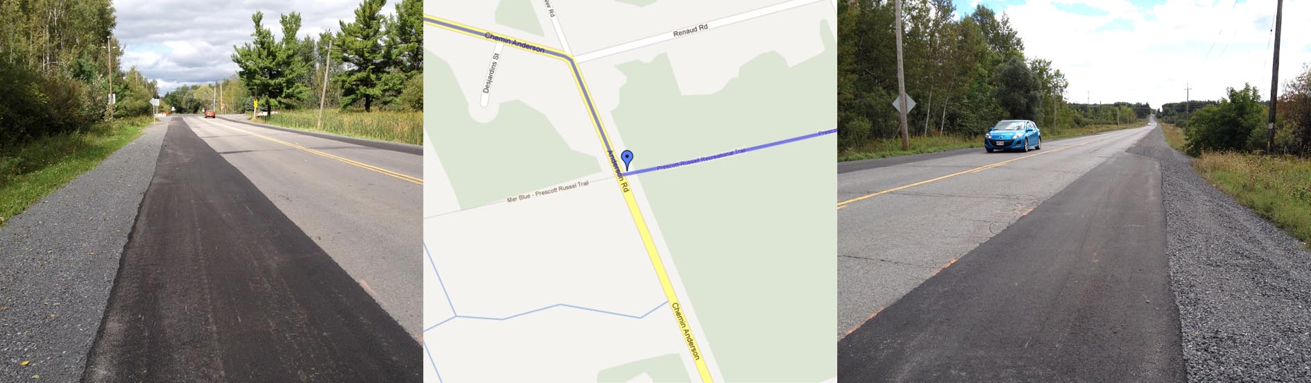 Part of the route took me a short distance along the Prescott-Russell Recreational Trail. This amazing trail runs along the old VIA Rail line almost all the way to the Quebec border. Working your way through the city to the trailhead is a bit tricky, especially choosing the safest way to get across the 417. Cyrville Road isn’t terribly bike friendly, but I find it a lot safer than crossing at Innes Road. There are dedicated bike lanes along Innes on the east side of the 417. They have also added paved shoulders along Anderson Road as far as the trail head, like so: