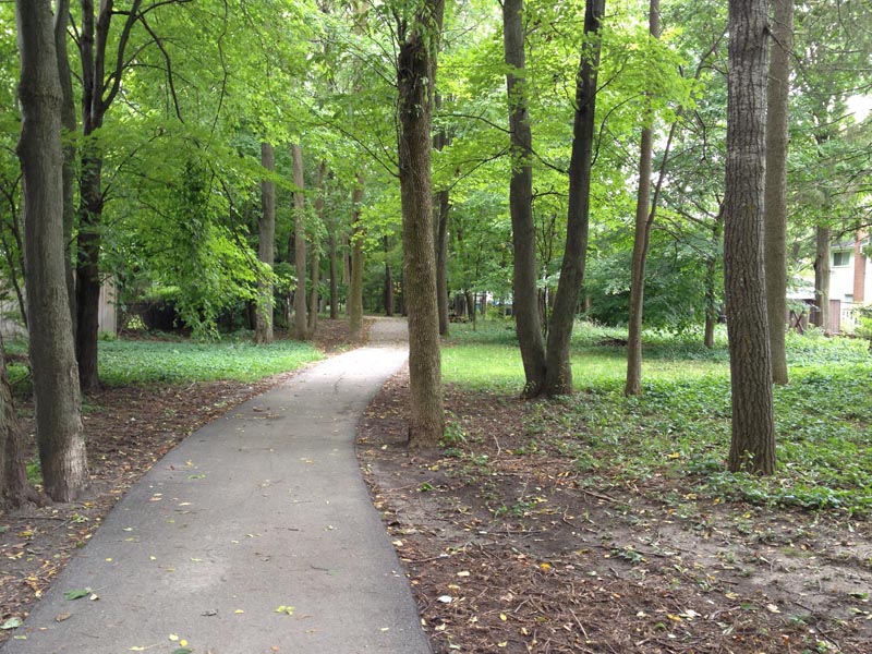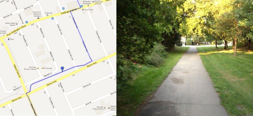 On my return trip I decided to bike along Navan Road to access the area of Blackburn Hamlet. Navan Road was awful (no shoulders, crumbling asphalt, speeding cars). Blackburn Hamlet was great. You’ll notice on the map how the bike path weaves its way through a narrow strip of parkland. The residential properties back right up to the path, providing rapid scenarios of folks enjoying their Sunday afternoon. Here’s what it looks like at one of its wider spots.