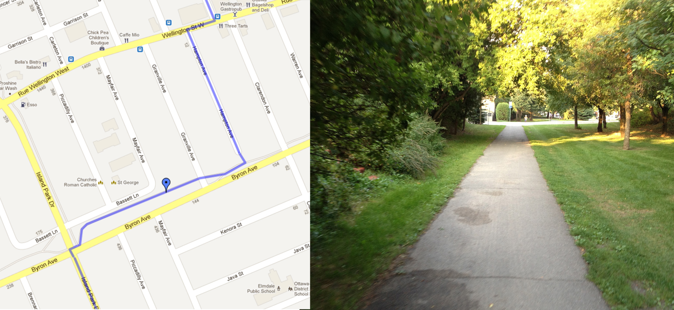 The route starts in Fisher Park on the pathway that runs parallel to Byron, accessible from any of the adjoining streets. Follow the path as far as Island Park Drive.