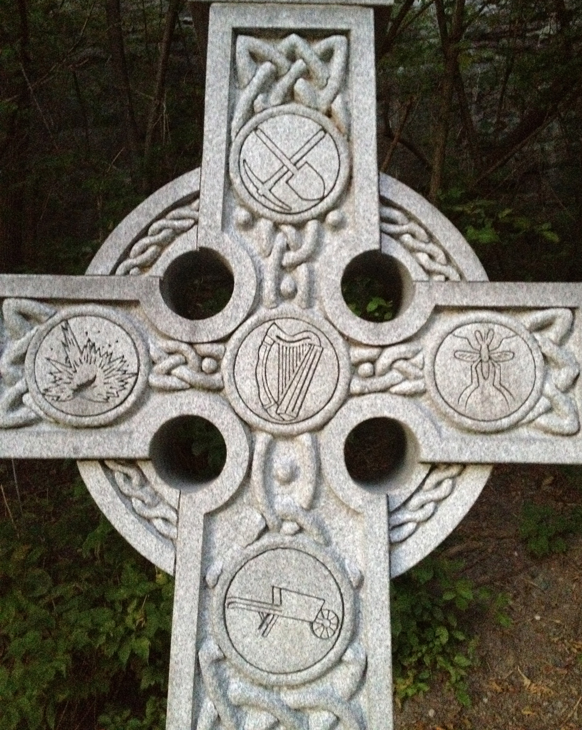 The glyphs engraved on the face of the cross suggest the work (pick, shovel and wheelbarrow) and the hazards (explosions and disease carrying mosquitoes) associated with the building of the canal. Not sure what the harp in the centre symbolizes other than reinforcing the celtic theme of the monument.