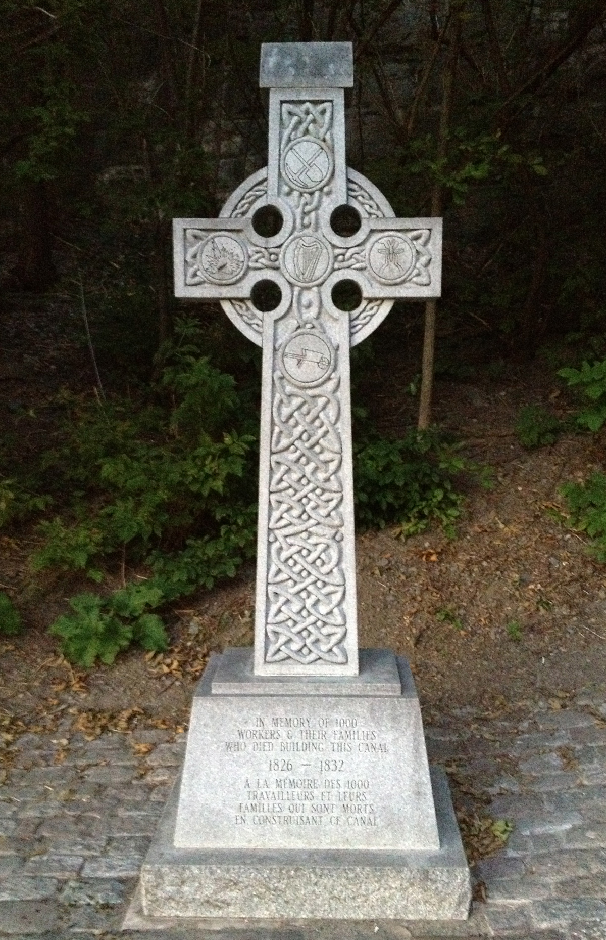 On the east side of the locks, close to where the above photo was taken, sits this small monument in the form of a celtic cross dedicated to those who died building of the canal. UPDATE, August 2017 – Unfortunately the cross was knocked over and has yet to be replaced.