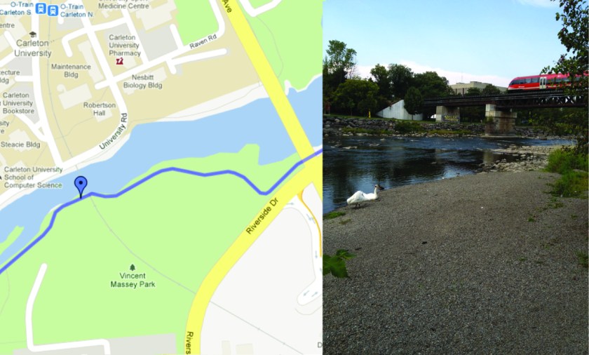 Midway down Morningside Lane turn left. That takes you to a crosswalk across Prince of Wales Drive. Continue straight through. The road turns right towards the canal locks across from Carleton Universty. After crossing the locks and carrying your bike down a few stairs, turn right up the bike path. Now it gets a bit convoluted once the path reaches Hogs Back Road. The path goes under the road, then along Hogs Back Road over the falls, and back under before continuing down the opposite side of the Rideau River.