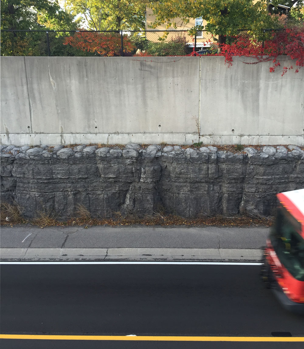 Our final stop is located along the bus transitway near Roosevelt Avenue. To get there we took the tunnel under the SJAM parkway at Westboro Beach, then followed Kirchoffer Avenue to the pedestrian bridge over the OC Transpo transitway. From the opposite side of the pedestrian bridge one can see a layered section of Stromatolites exposed at the top of the stone channel that was cut to create the transitway.