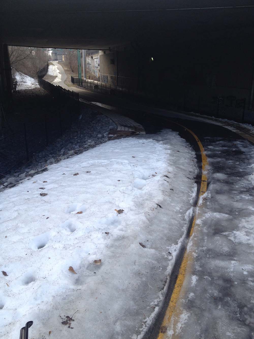 … until just west of the museum, where you will encounter this pile of mush, then patches of slushy ice beyond.