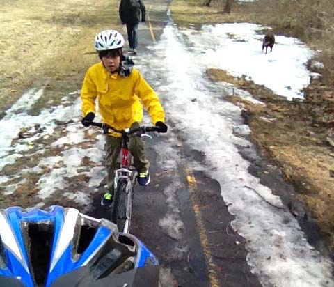Usually we would have ridden west along the Ottawa River Pathway starting at the Portage Bridge, but with rumours of river banks flooding, and memories of how much the path was inundated last Spring I decided to cut through Hintonburg to the bike lane along Scott. Traffic is usually less frantic on the weekend, and I didn’t want to push my luck on the distance my son could ride as it’s a more direct route than riding along the Ottawa River pathway. At the western end of Scott we followed the path along the transit-way that joins the path along the south side of the parkway. This section of bike path was fine, apart for just a few muddy puddles like so.