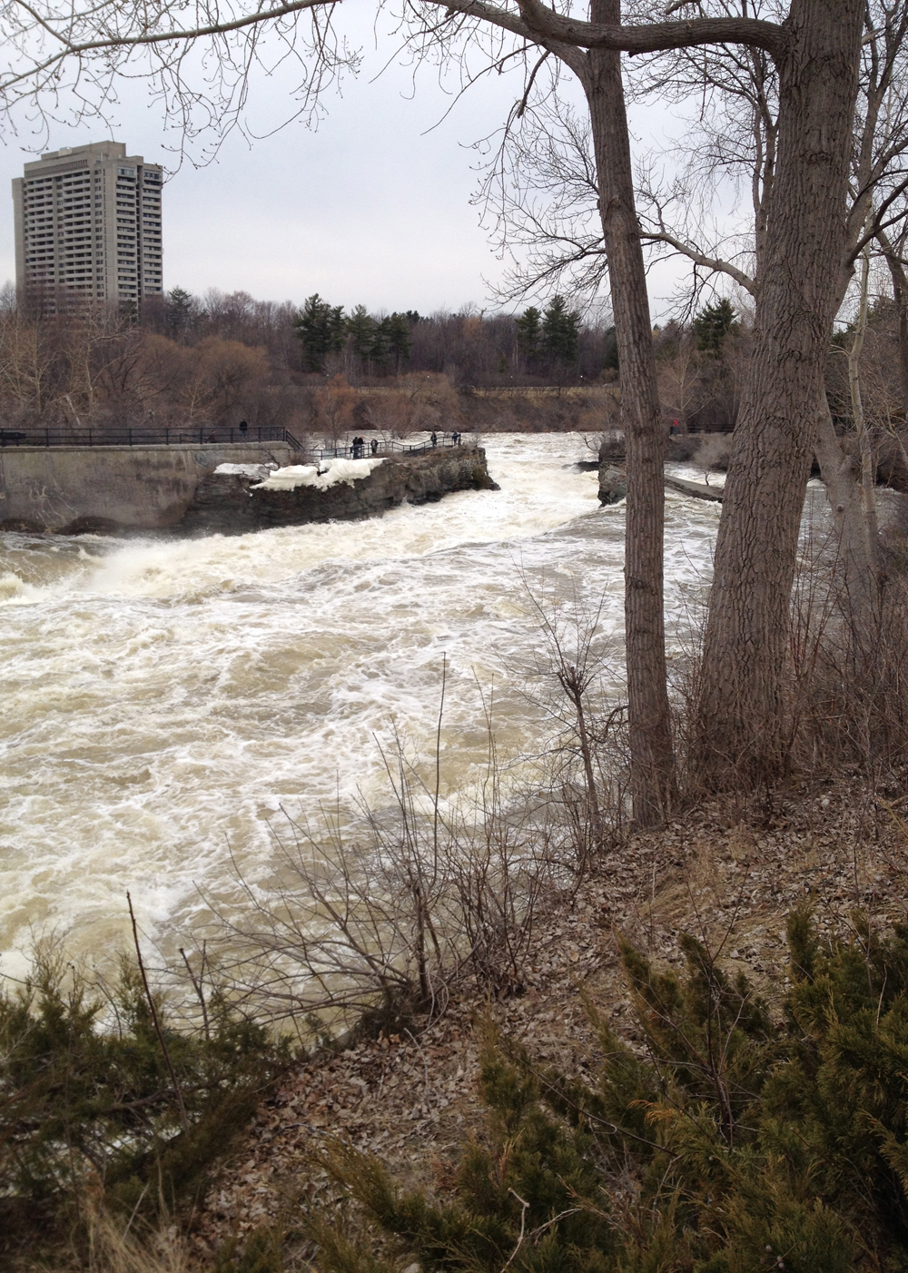 Hog’s Back Falls is a pretty spectacular sight at this time of year as a result of the spring melt off. The falls were created at the time of the construction of the Rideau Canal, as explained in this very interesting post. On day 18 of 30 Days of Biking, my son and I biked over to check them out, and discovered some wonderful vantage points.