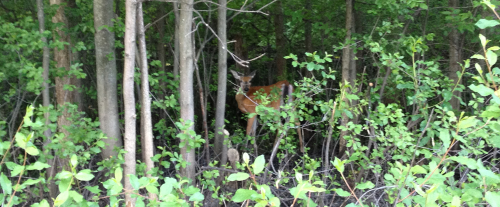 After contemplating the mysterious wreck you can rejoin the Voyageurs Pathway. I came across three deer munching grass between the pathway and Boulevard Fournier, including this fellow! The biker in the reflective vest calmly rode by saying, ‘C’est beau la nature, hein?’.